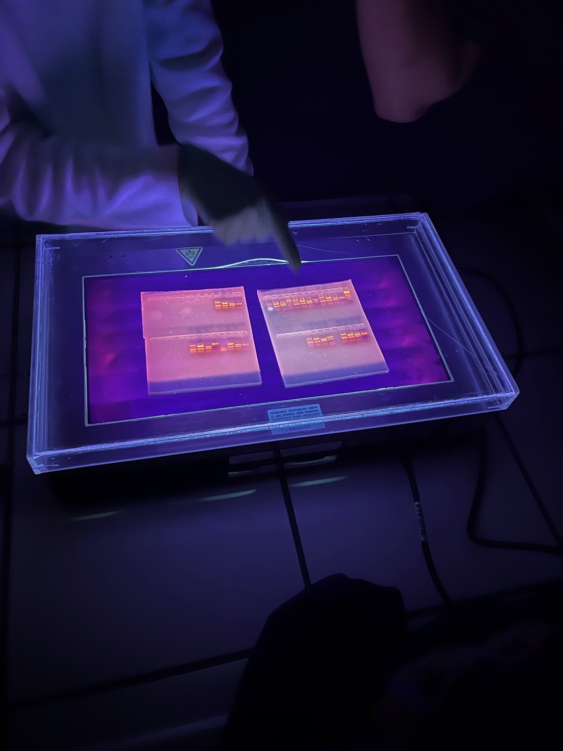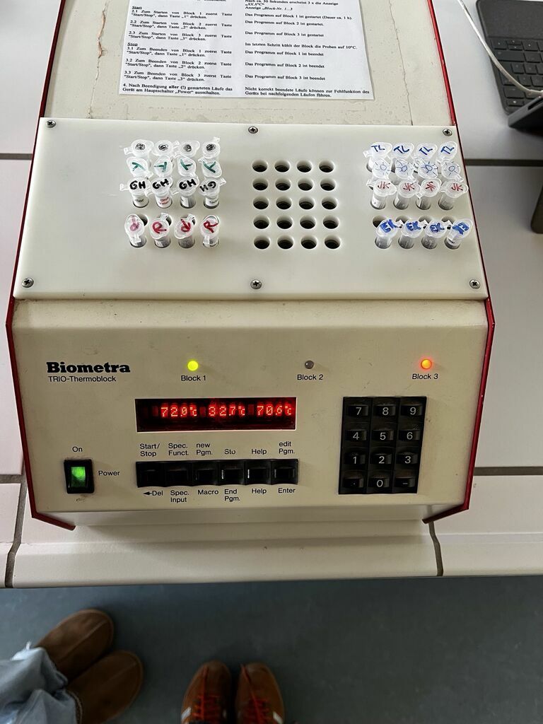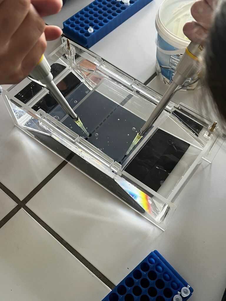 Wir präparierten die DNA-Proben und gaben sie anschließend in den Thermocycler. Dann liefen die Temperaturzyklen ab und wir bereiteten in der Zwischenzeit die Gelelektrophorese vor, um anschließend die DNA-Fragmente abzulesen. Wir erstellten ein spezielles Gel mit dem Nachweisfarbstoff Ethidiumbromid und warteten auf das Ergebnis. Zu unser aller Erstaunen war es nicht, wie im Tatort üblich, der Gärtner sondern der Postbote!