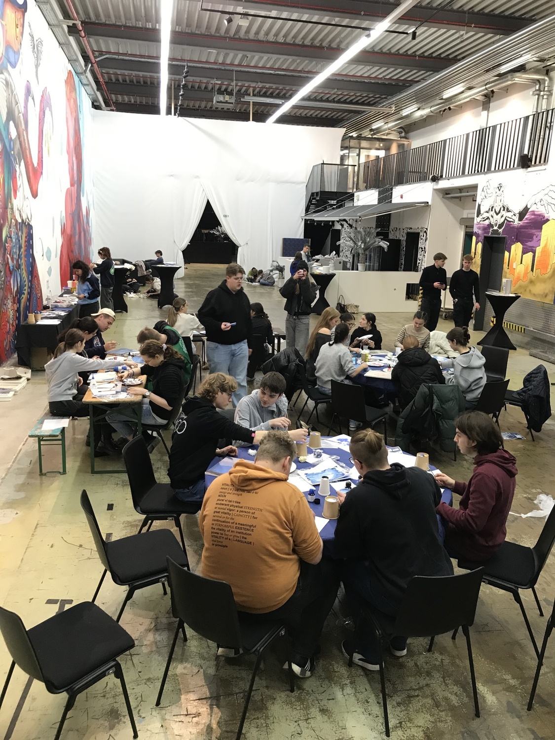 Zwischendurch machten wir eine Mittagspause, in der wir gemeinsam die bestellte Pizza genossen. Danach ging es direkt weiter: Die Gruppen wechselten. Diejenigen, die zuvor drinnen gearbeitet hatten, gingen nach draußen, um mit Spraydosen an den großen Leinwänden zu arbeiten. Gleichzeitig konnten die, die noch nicht an ihren Einzelprojekten gearbeitet hatten, diese im Innenbereich umsetzen und vollenden.