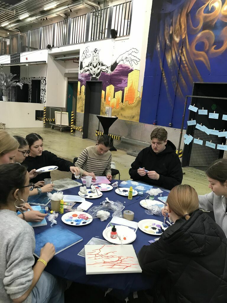 Am Ende des Workshops räumten wir den Raum gemeinsam auf. Es war beeindruckend, die Ergebnisse zu sehen: Von großformatigen Leinwänden bis hin zu individuellen Einzelprojekten zeigten die Werke die kreative Vielfalt unserer gesamten Gruppe. Dieses Kunstprojekt wird der gesamten Stufe in Erinnerung bleiben. Es bot uns nicht nur die Möglichkeit, künstlerisch aktiv zu werden, sondern auch, unsere Kreativität in einem professionellen Umfeld frei auszuleben. Ein großer Dank geht an Frau Bindseil und Frau Gürlich für die Organisation und Durchführung dieses inspirierenden Projekts. Es war ein Tag, an dem wir nicht nur kreativ waren, sondern auch als Gruppe zusammengewachsen sind.
