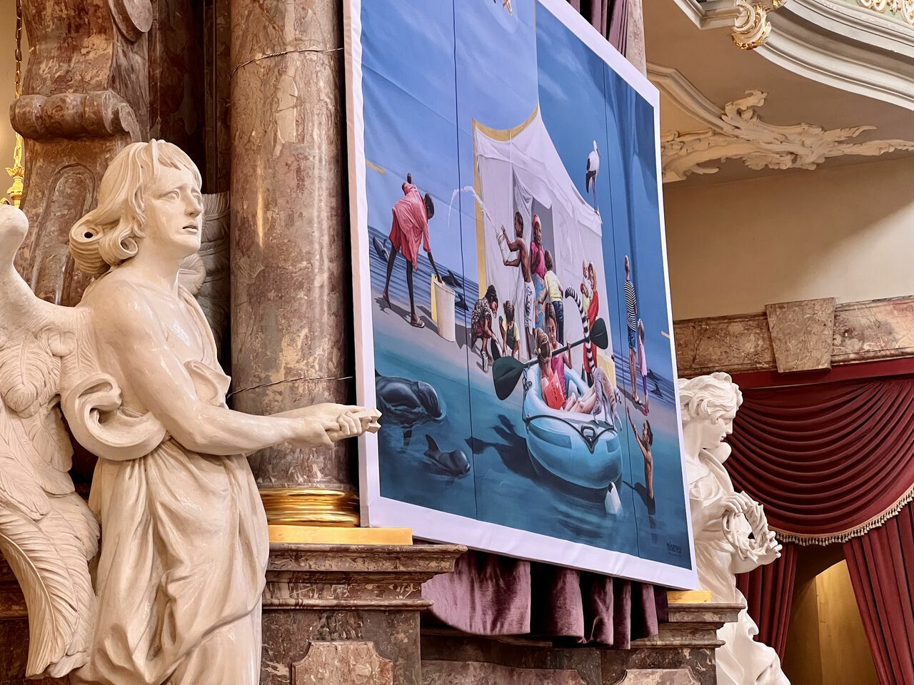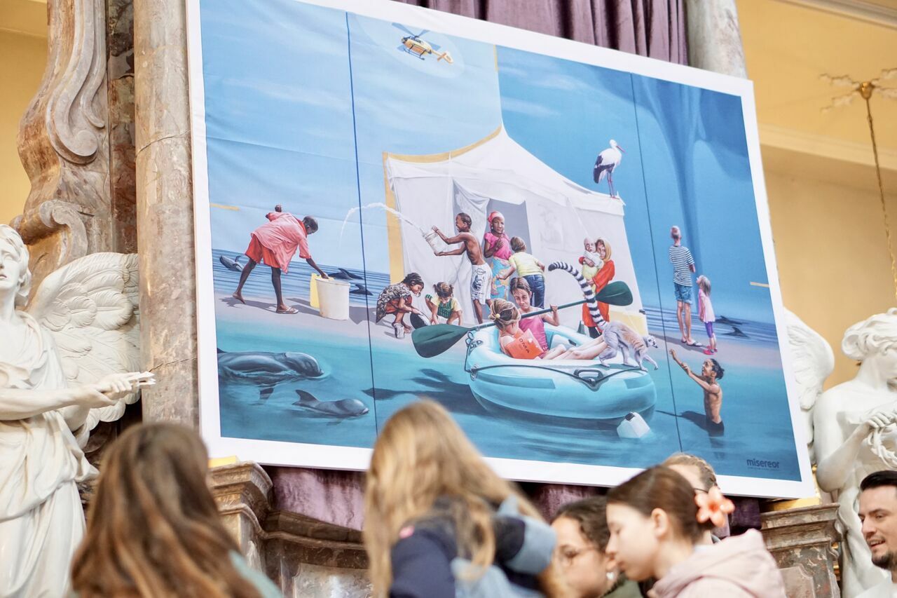 Vor den Osterferien nutzte das UGM den Gottesdienst, um zur Ruhe zu kommen und sich auf das Osterfest einzustimmen. Der von Herrn Timpe und Frau Weber organisierte Gottesdienst stellte das Hungertuch von Misereor in den Mittelpunkt. Es trägt den Titel: "Gemeinsam träumen - Liebe sei Tat". Das Hungertuch zeigt eine Szenerie zwischen Strandurlaub und Flüchtlingslager und lässt diese Welten aufeinanderprallen. Die vielen Kinder, die auf dem Bild zu sehen sind, stammen aus allen Ländern der Erde.