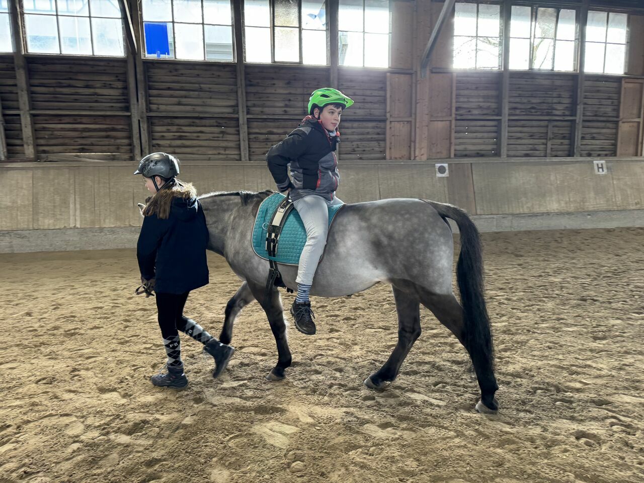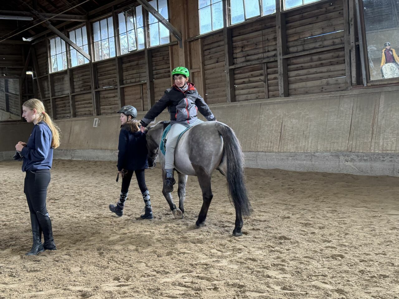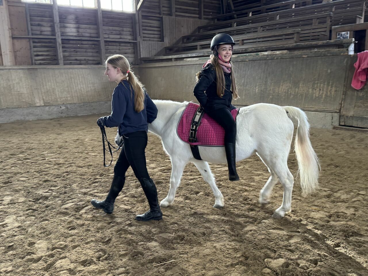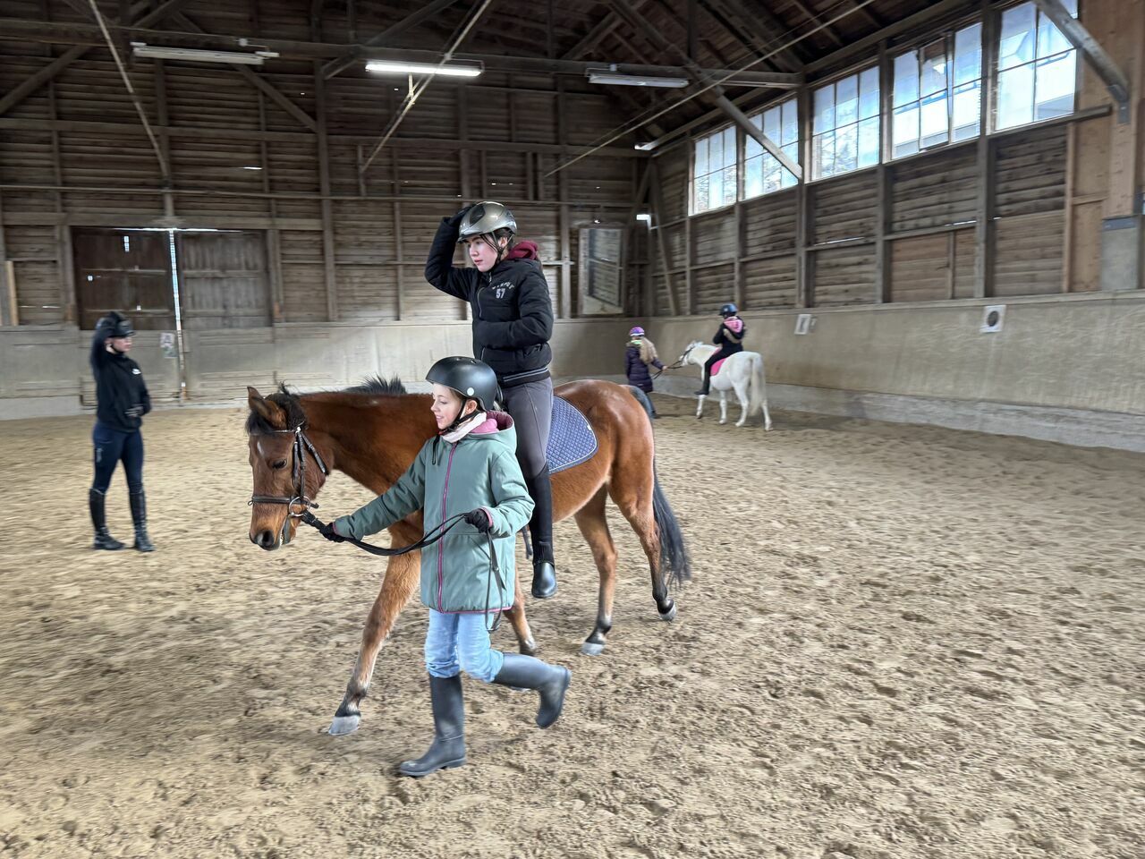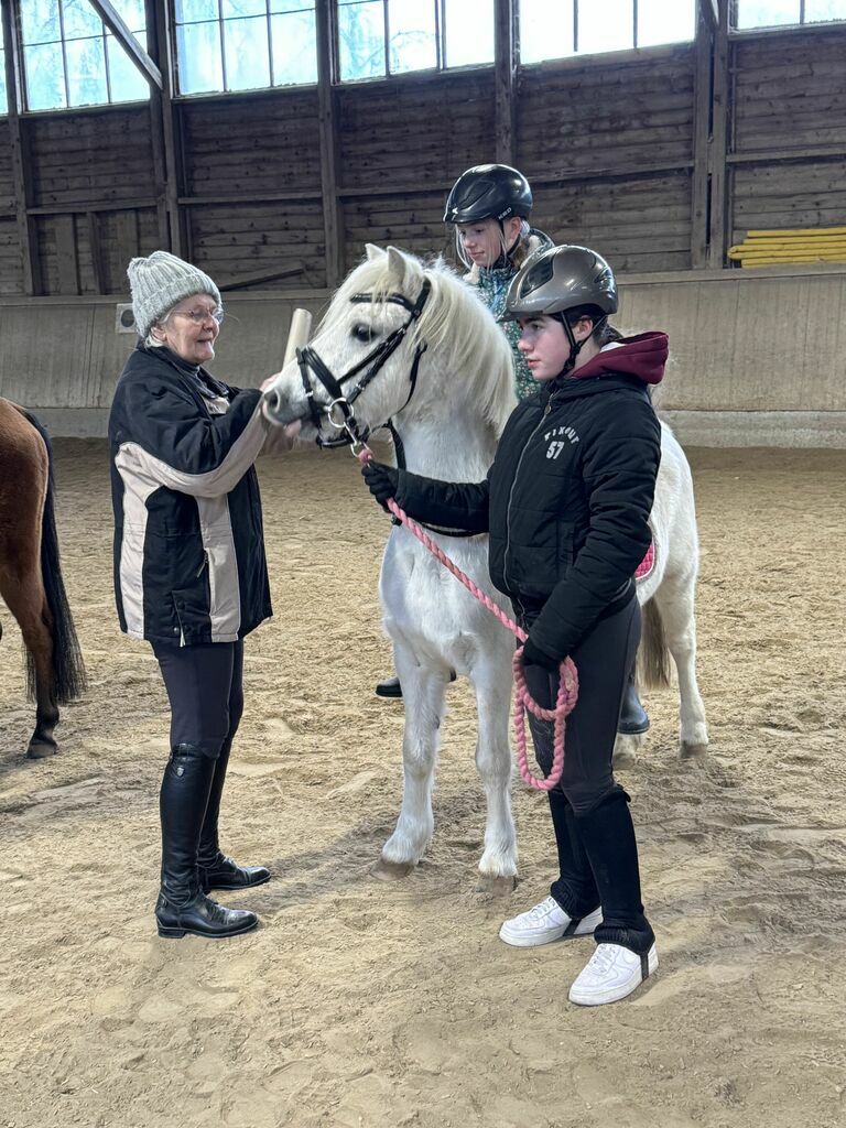 Fünf Schülerinnen haben sich aus dieser Gruppe für den Fortführungskurs angemeldet und durften in den Genuss kommen, von Sr. Regina geführt, eine Runde auf dem Großpferd Franz zu machen. Da konnte man dann strahlende Kindergesichter sehen- so hoch zu Ross, das war doch ein Highlight.