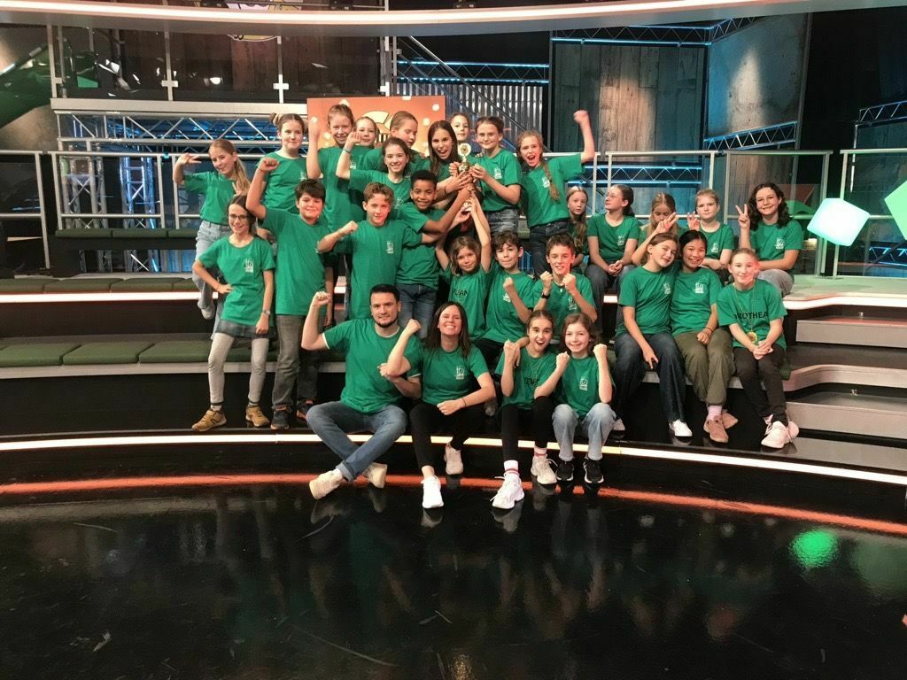 Im Finale entschied sich dann alles im TigerentenRodeo. Mit 5 Notbremsen bei den Fröschen und 6 bei den Tigerenten schwang sich Julian auf die Tigerente und los ging´s! Zu Beginn war es ein bisschen schwer, doch er hielt sich tapfer und wenn’s mal ein bisschen schwerer wurde, hatten wir ja noch die Notbremsen. Die Freude von allen Fröschen war groß, als das Spielekind der Tigerenten von der Tigerente runterfiel, während Julian weiterhin oben saß. Nach einer orangenen Schleimdusche für die gegnerische Lehrerin wurde uns der goldene Pokal sowie die Medaillen überreicht. Nun konnten wir alle gemütlich nach Hause fahren. Der Pokal ist spitze, aber vor allem der tolle Tag, den wir dank unseren Klassenlehrern Frau Bindseil und Herr Möller erleben durften. Vielen Dank dafür! Mit Sicherheit wird dieser Tag von Niemandem so schnell vergessen werden! Wenn ihr Lust habt, unseren Sieg im Fernsehen zu verfolgen, dann schaltet doch gerne zu folgenden Zeiten ein: