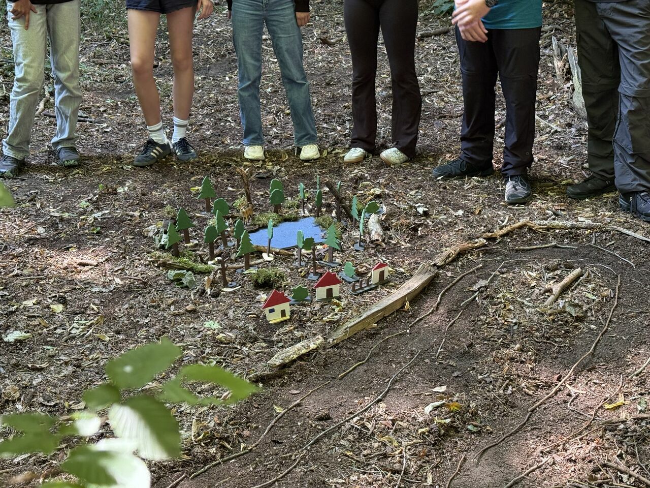 Danach erhielten wir kleine Kärtchen mit Informationen über den Wald. Diese sollten wir den Kategorien Nutzfunktion, Schutzfunktion und Erholungsfunktion zuordnen. In den jeweiligen Gruppen erstellten wir dann kreative Präsentationen in Form von „Instagram-Posts“ – in Wirklichkeit kleine Theaterstücke oder Vorträge, da wir unsere Handys nicht verwenden sollten. Im Anschluss daran bekamen wir die Aufgabe, unseren eigenen „Traumwald“ zu gestalten – mit kleinen Figuren wie Bäumen, Tieren, Häusern und Fabriken. Wir erklärten einander, wie wir den Wald aufgebaut hatten und welche Funktionen er erfüllen sollte.