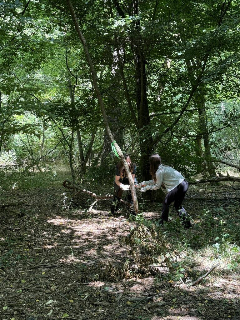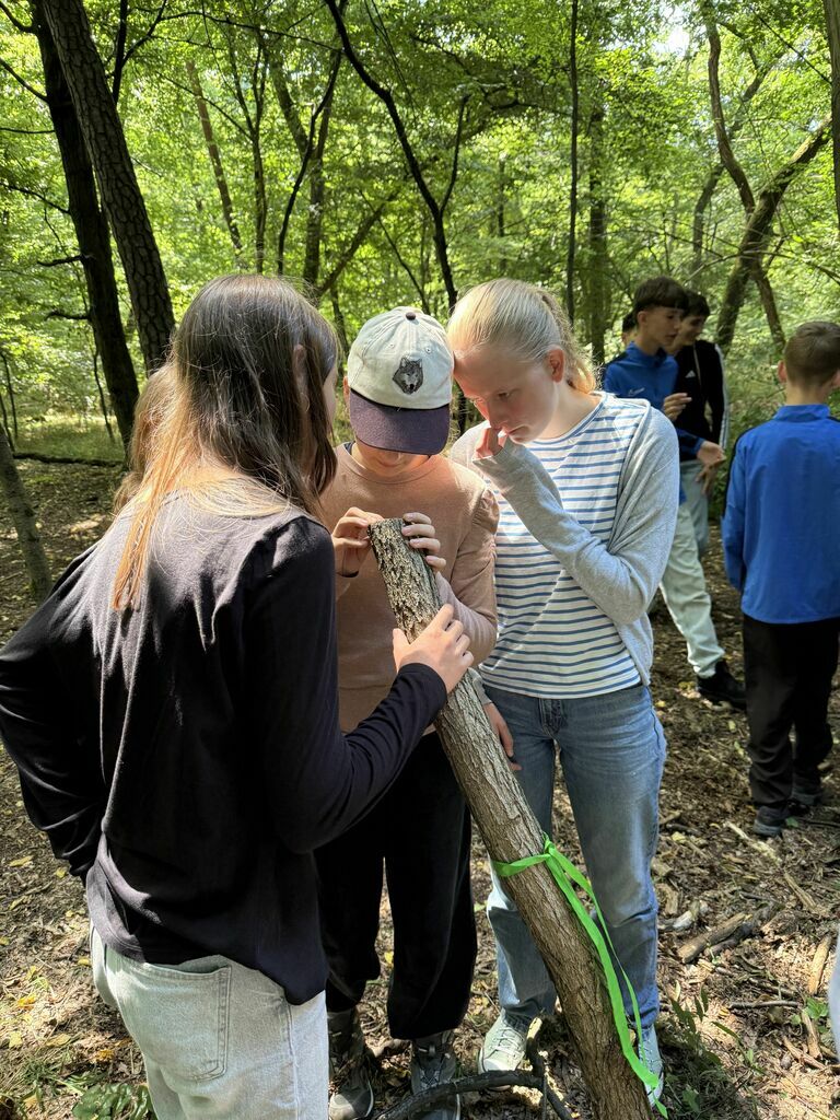 Anschließend bildeten wir Fünfer- oder Sechsergruppen, jede Gruppe wählte einen Baum aus. Im Umkreis von zehn Metern um diesen sollten wir den Durchmesser aller Bäume messen, deren Art bestimmen und die Ergebnisse dokumentieren. Das war teilweise ziemlich kompliziert und erforderte gute Zusammenarbeit, denn jede Person hatte eine andere Aufgabe: das Maßband oder die Messkluppe halten, Baumarten bestimmen, aufschreiben usw. Außerdem sollten wir überlegen, welchen Baum wir theoretisch fällen würden – dabei mussten Alter und Standort berücksichtigt werden.