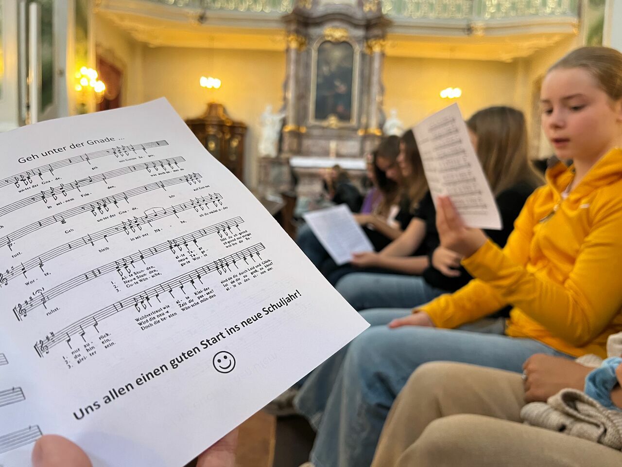 Mit dem Lied „Wir haben Gottes Spuren festgestellt“ wurde die Verbundenheit mit Gott noch einmal musikalisch zum Ausdruck gebracht. In den darauffolgenden Fürbitten brachten Samuel, Jonas, Mila, Nele, Gloria und Victoria (alle 10a) ihre Gedanken, Hoffnungen und Bitten für das bevorstehende Schuljahr vor Gott.