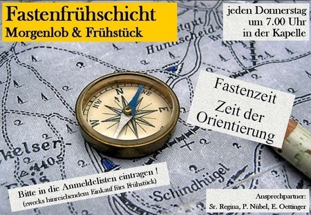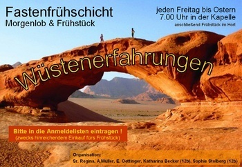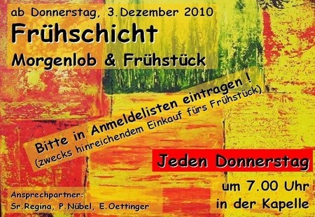 In jeder Advents- und Fastenzeit bieten wir wöchentlich an einem Morgen um 7.00 Uhr einen Morgenimpuls in der Kapelle an. Ab etwa 7.20 Uhr frühstücken wir dann gemütlich in den Räumen des Horts. Über Anmeldelisten ist am Tag zuvor bekannt, wie viele Teilnehmer kommen, so dass wir dann entsprechend den Tisch decken und einkaufen können.