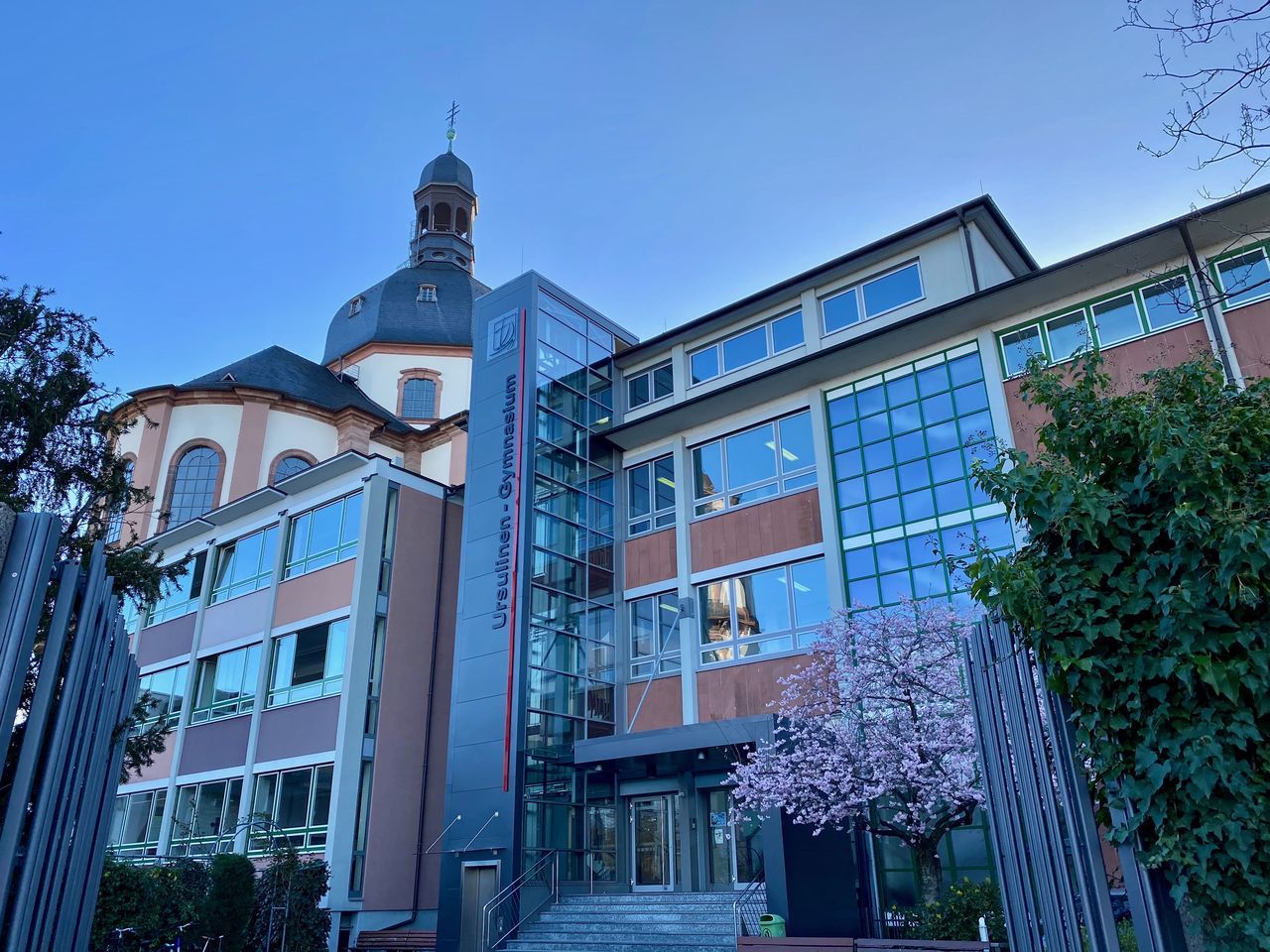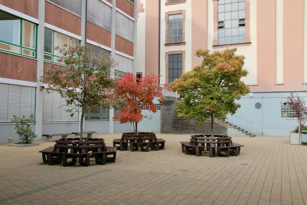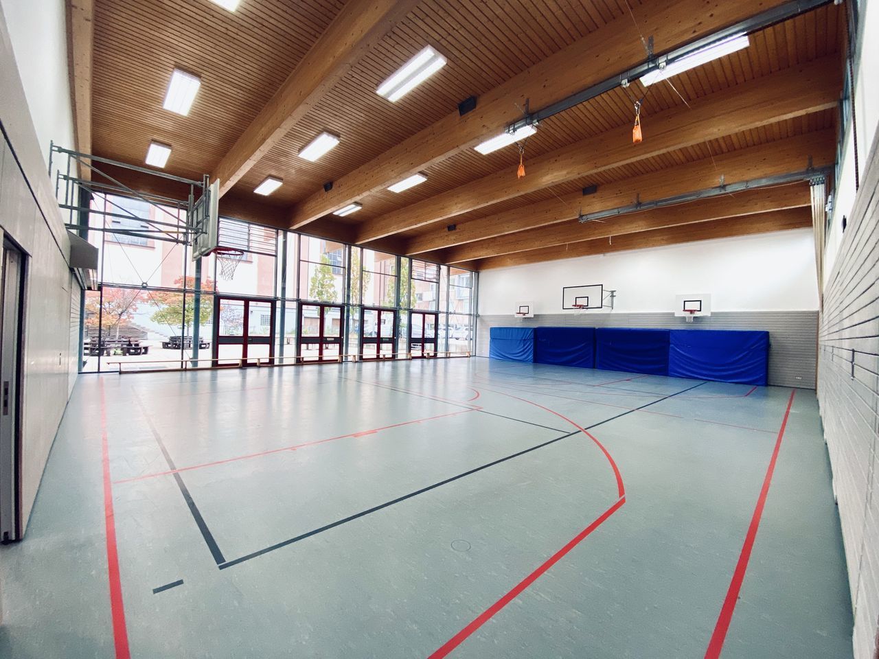 Die Schulleitung und das Sekretariat sind im Haupthaus zu finden, wie auch das lichtdurchflutete Foyer sowie die Turnhalle. Beide Räumlichkeiten sind großflächig und haben Zugang zum großen Schulhof, weshalb sie für Veranstaltungen wie z.B. den Adventsbasar oder das Sommerfest genutzt werden.