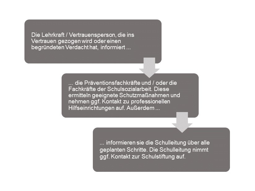 Leider werden insbesondere Kinder und Jugendliche im Schulalter häufig zu Opfern sexualisierter Gewalt. Im Verdachtsfall halten wir uns an folgende Handlungskette:
