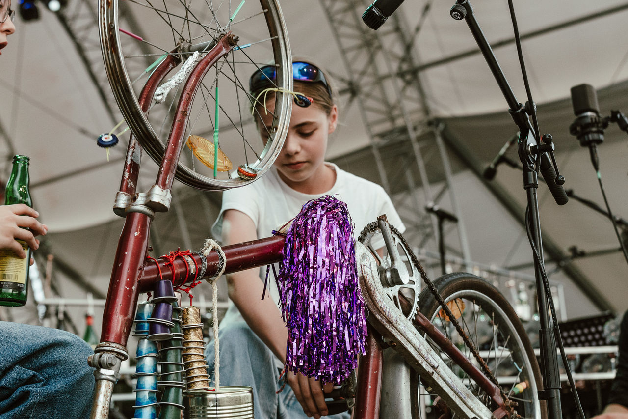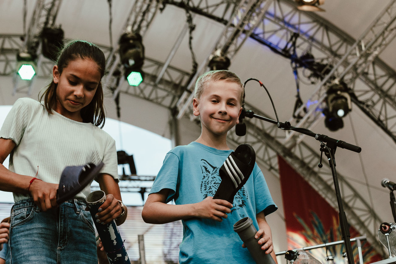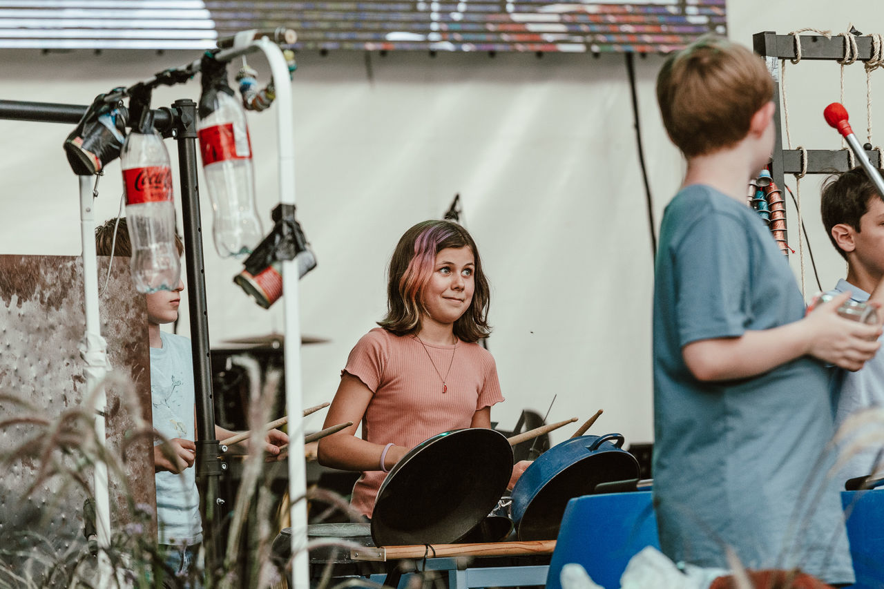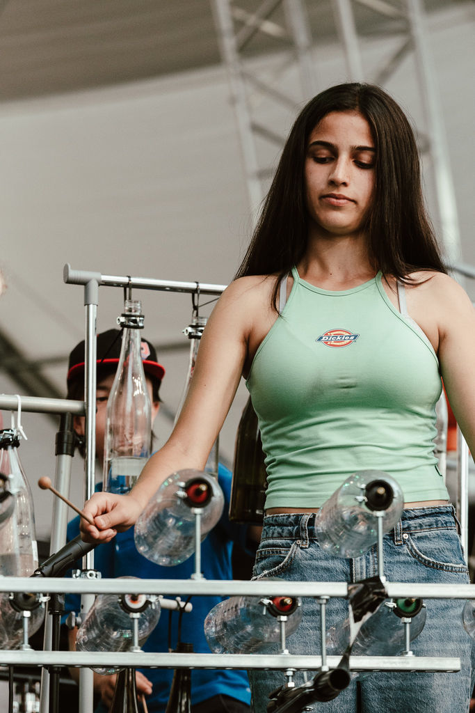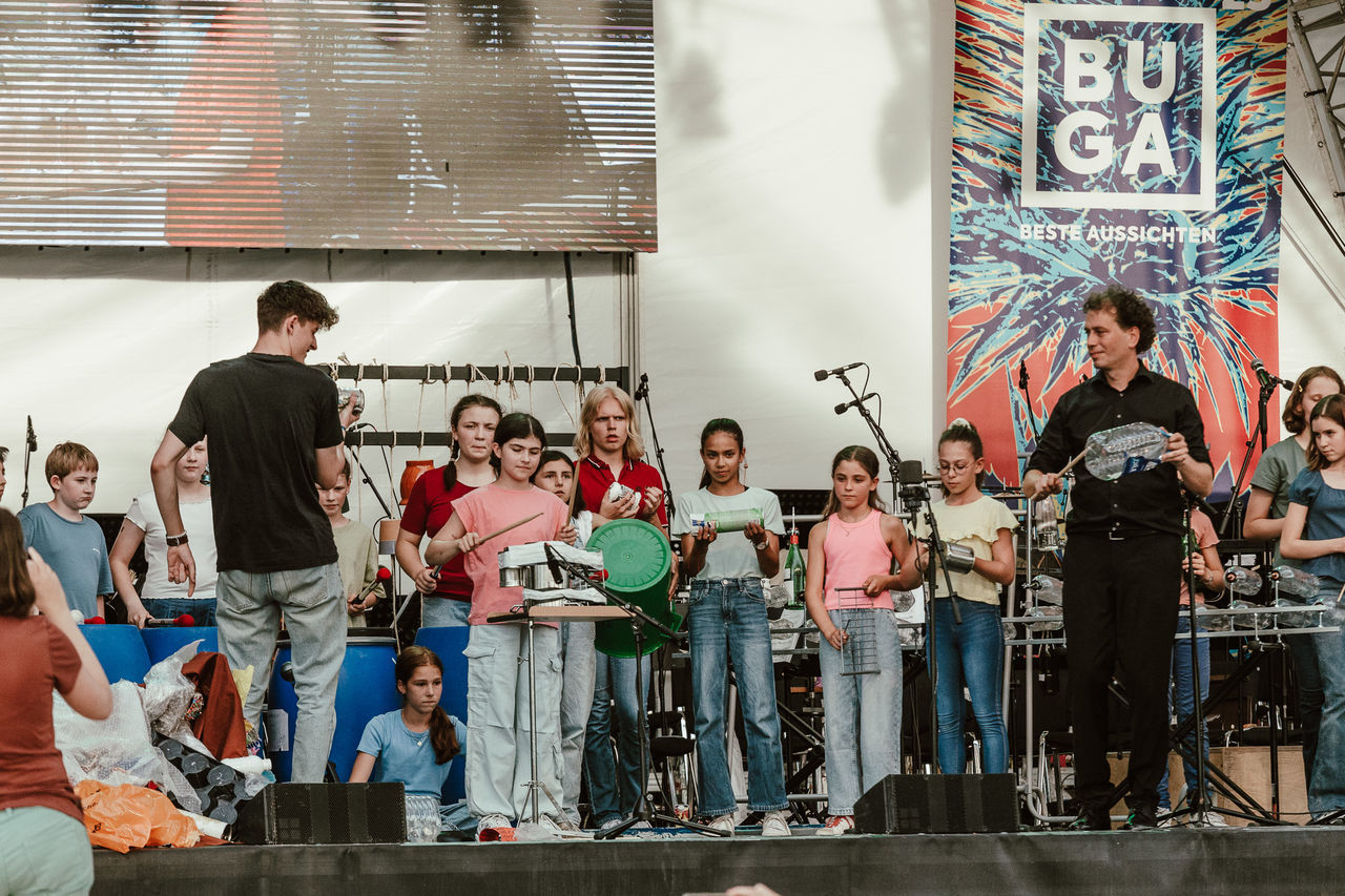 Etwa 700 Besucherinnen und Besucher kamen am Abend des 9. Juli zur Hauptbühne Spinelli auf der Bundesgartenschau, um dem Gemeinschaftskonzert der Mannheimer Bläserphilharmonie und des neu gegründeten Upcycling-Orchester des Ursulinen-Gymnasiums Mannheim zu lauschen. Eine beeindruckende Kulisse! Nach der Eröffnung durch die Bläserphilharmonie gehörte die Bühne für eine halbe Stunde den 30 Schülerinnen und Schülern des Ursulinen-Gymnasiums. Gespielt wurden selbst komponierte und erfundene Stücke – experimentelle Musik im Stile John Cages über Minimal Music und Samba bis hin zu einem groovenden Techno.